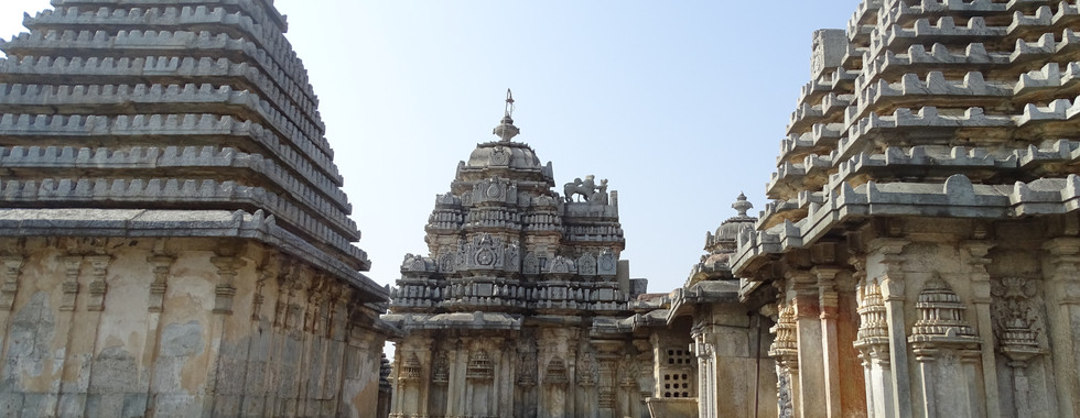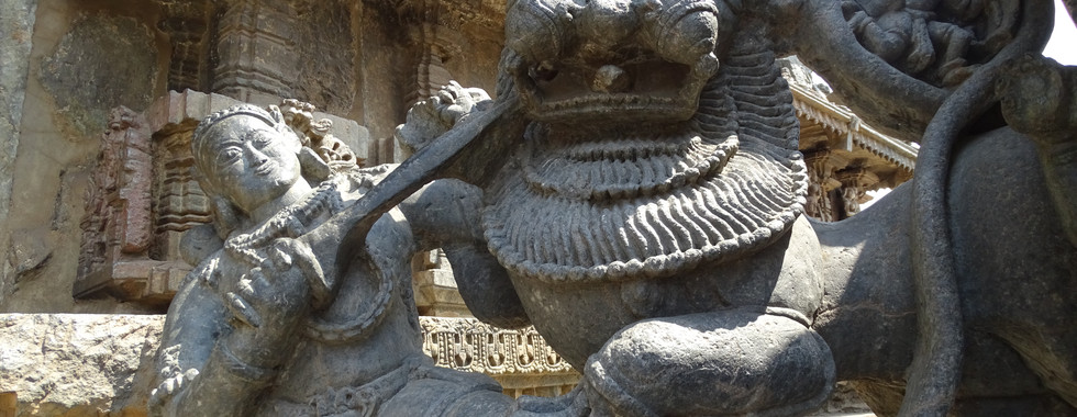 Vishnuvardhana moved the capital of Hoysala empire from Belur to Halebeedu and started constructing the Hoysaleswara temple there. Halebeedu is another majestic architectural marvel of the Hoysalas and legend says it is only half done. The detailing on the walls and pillars confirms the fact that this took hard work of 4 generations over 190 years. The temple comprises of 108 pillars each of different design. And the temple walls are decorated with a stone carving belt that depicts different Indian mythologies including the Mahabharata and the Ramayana. A few unfinished portions can be seen in carvings on the walls. Temples of Halebeedu and Belur were the main targets of attacks during the invation by the Delhi sultanate.
